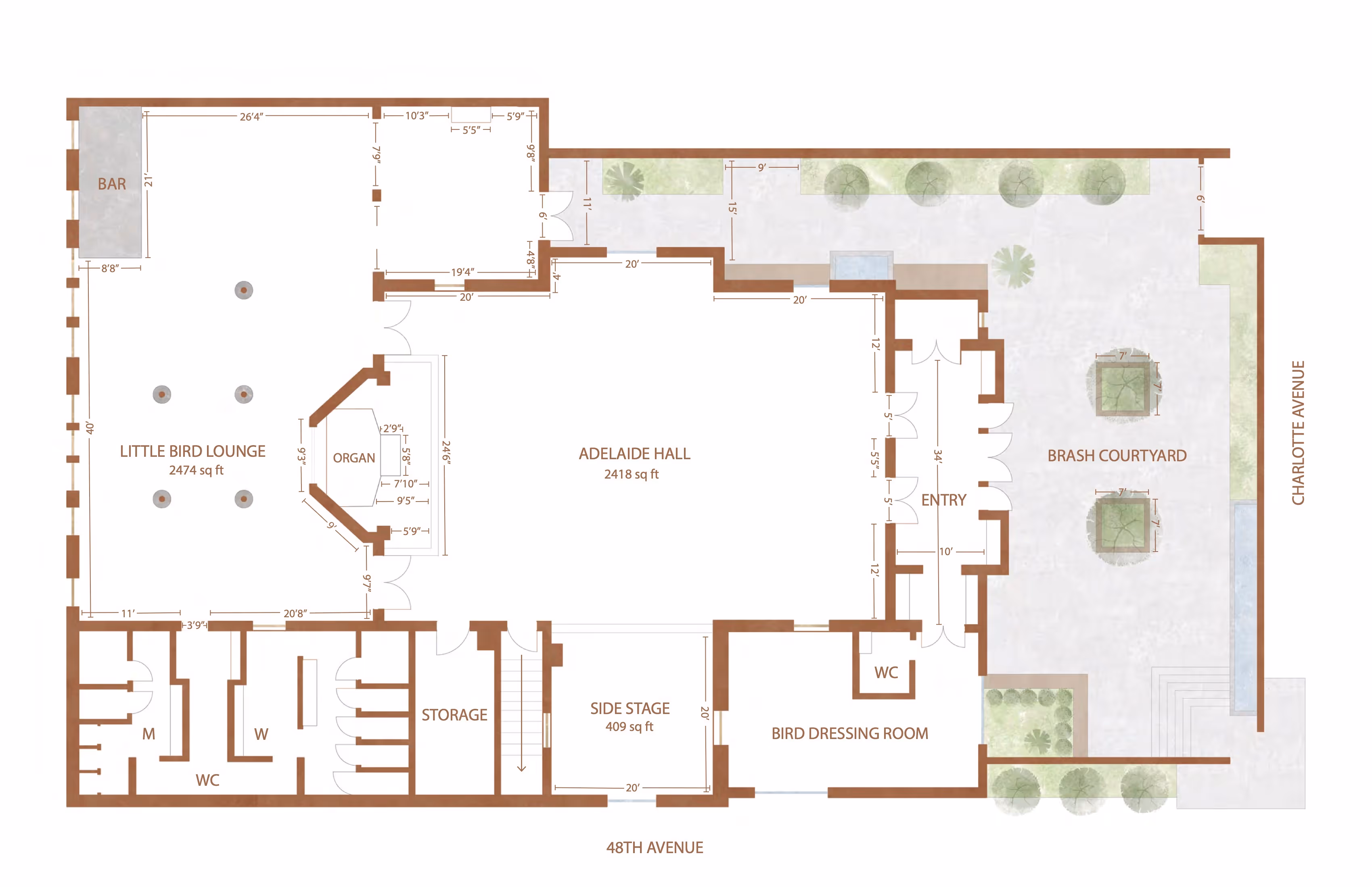 Clementine is a beautiful and efficient interplay of design, building systems, and space layout. The building is comprised of four main spaces: Adelaide Hall, Little Bird Lounge, Brash Courtyard, and a collection of smaller areas (3 dressing rooms, entryway, and catering kitchen).